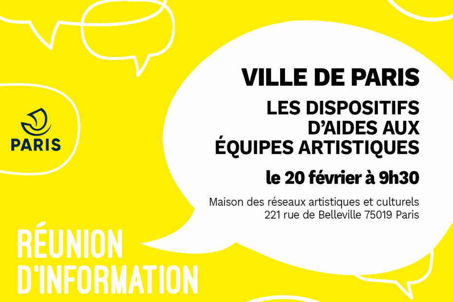 En lien avec l’équipe du Bureau du spectacle de la ville de Paris, nous vous convions à une réunion d’informations autour des dispositifs de soutien… Lire la suite »Réunion d’information : Dispositifs de la ville de Paris